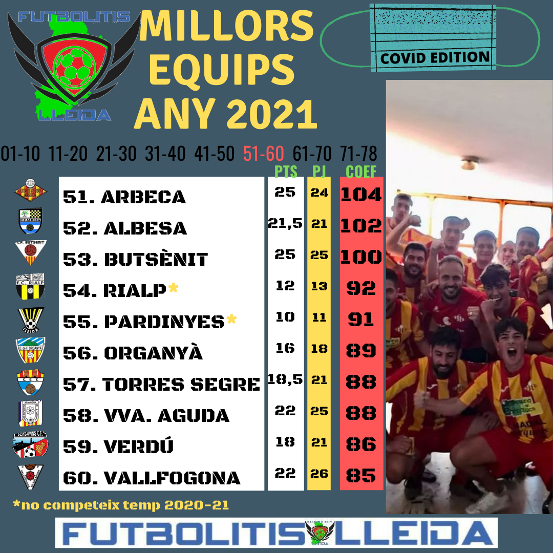 El cinquè lloc és per Alpicat equip invicte aquest 2021ja que només ha jugat des del setembre, igual que Castellserà i Torrefarrera.